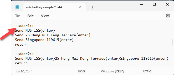 - Line 16: The hotstring "nus1" is preceded by 2 colons in front, and another 2 colons at the back